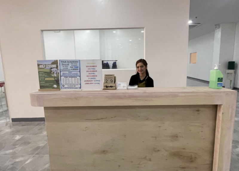 9 : 30 AM:受付でレベルテストのために教室をチェックします。